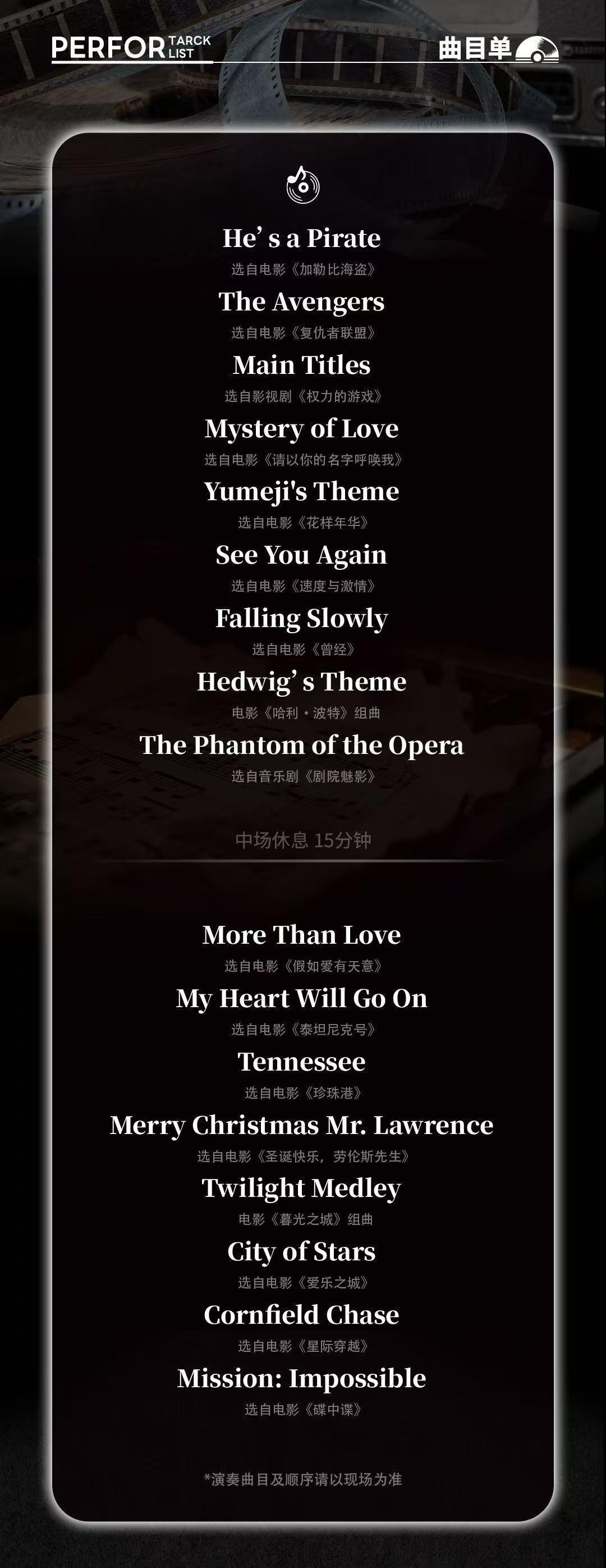 | 禁止携带物品 | 食品、饮料、相机、充电宝、打火机等 | 发票说明 | 如需开具发票,请在演出结束后一个月内联系客服并提供开票信息:票款发票由商家开具,平台服务费发票由票牛开具。 |