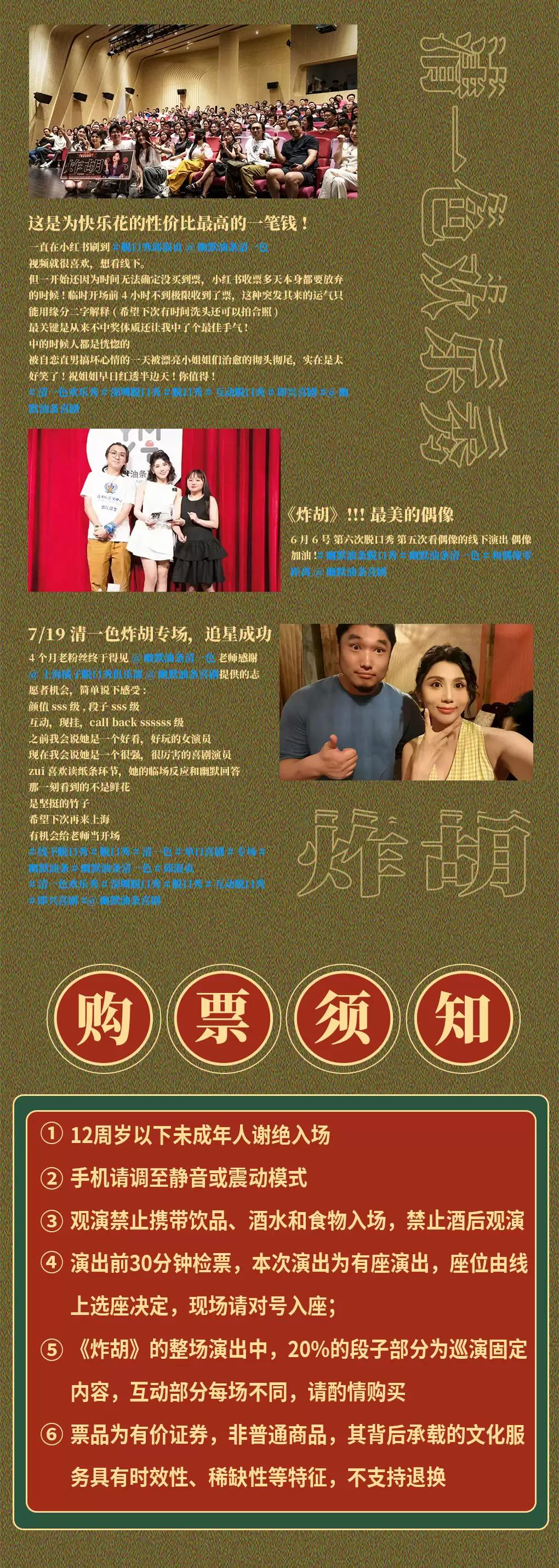 | 重要提示 | 演出现场气氛热烈,请您务必根据自身身体状况酌情是否购票参与观演,特别是患有心脏类疾病、急性心脑血管疾病、心肌炎、高血压等相关疾病的人群,请您务必遵照医嘱,结合病史及个人身体状况进行观演,观演期间请自行承担身体健康相关责任。 | 温馨提示 | 购买前请您提前规划好行程,做好相应准备,以免影响您的正常观演,感谢您的理解和配合。 若演出受不可抗力影响延期或取消,票牛将对演出票订单按照项目官方通知方案进行处理,其他因观演发生的费用需由您自行承担。 |