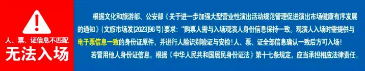 | 温馨提示 | 购买前请您提前规划好行程,做好相应准备,以免影响您的正常观演,感谢您的理解和配合。 若演出受不可抗力影响延期或取消,票牛将对演出票订单按照项目官方通知方案进行处理,其他因观演发生的费用需由您自行承担。 | 电子票 | 本项目支持凭电子票入场。 -请至少提前一天购买,开演前24小时内,票牛会发送取票短信,请按短信提示内容取票。 |
