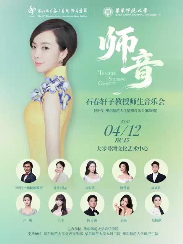 本场音乐会由华东师范大学石春轩子教授领衔,上海音乐学院李玮捷副教授担任艺术指导,特邀华东师范大学金鑫副教授,并携多位优秀学子,将师韵生音唱响大零号湾文化艺术中心。